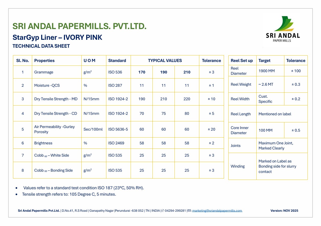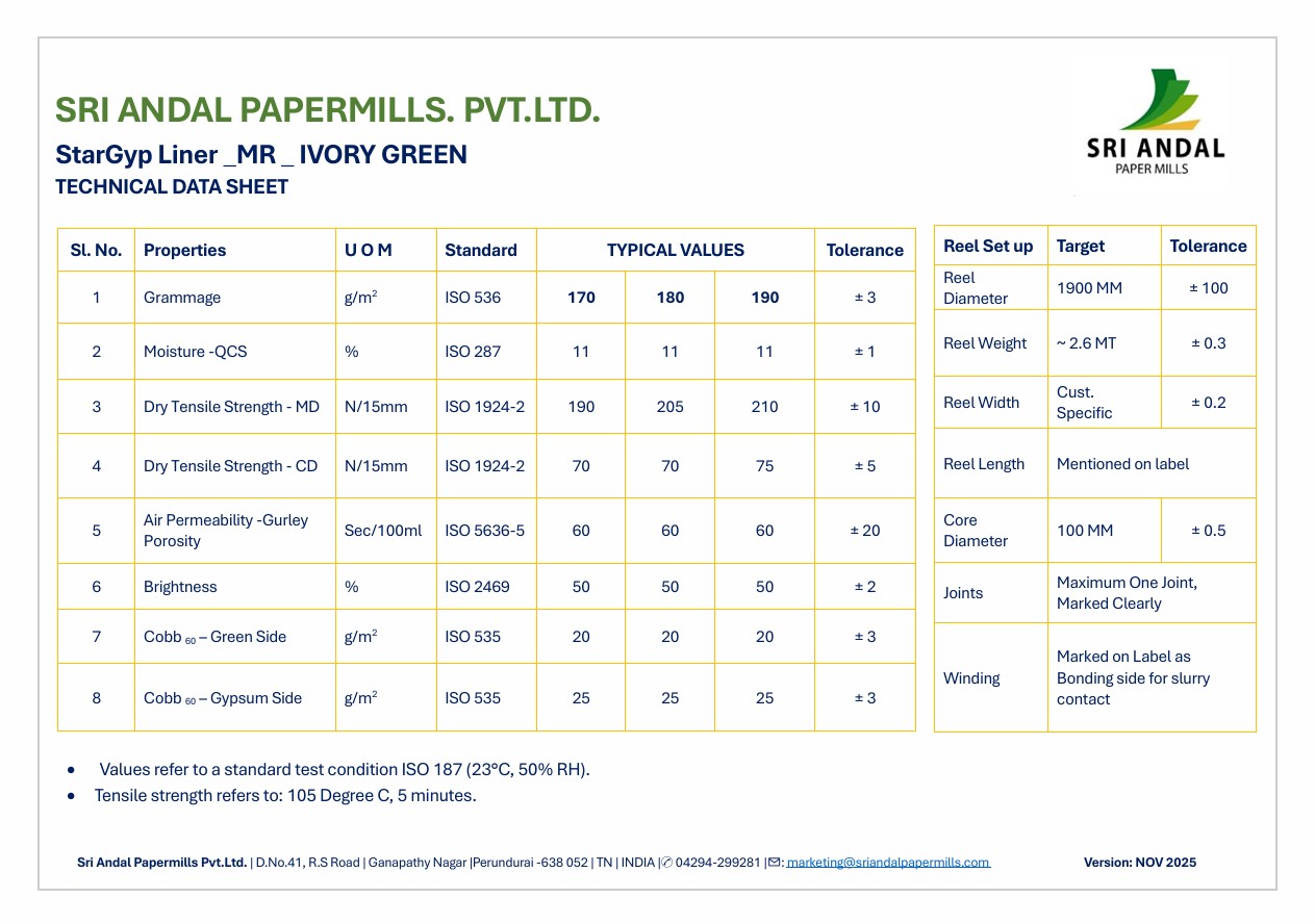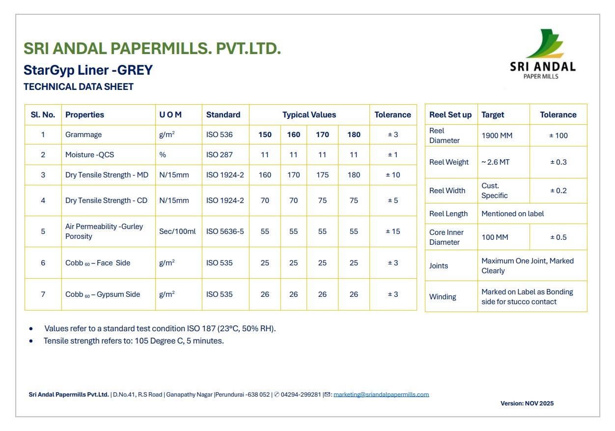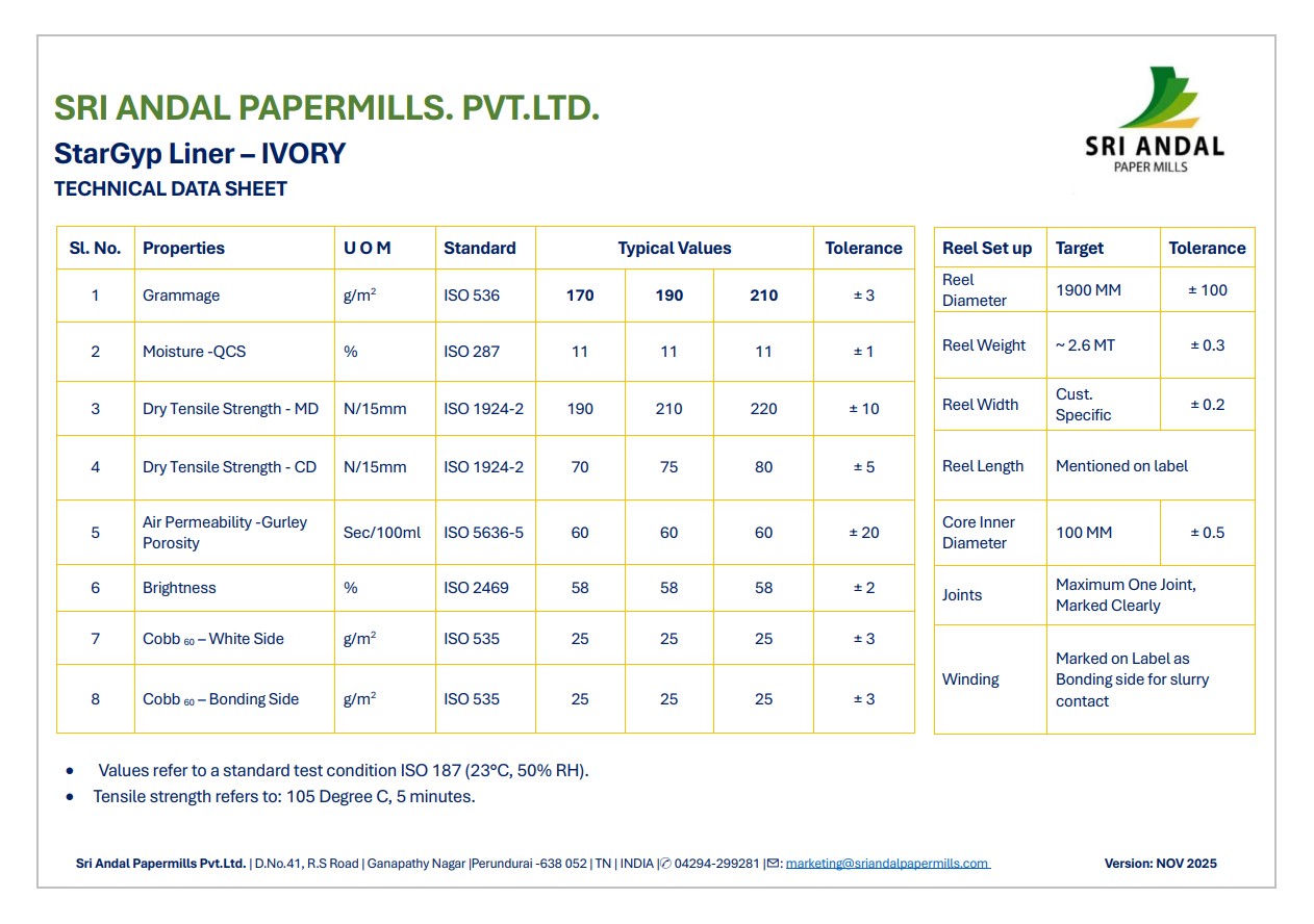 Committed to sustainability, Sri Andal Paper Mill produces StarGyp Plasterboard Liner Paper using eco-conscious processes and materials. It's recyclable, supporting green building practices and reducing environmental impact.