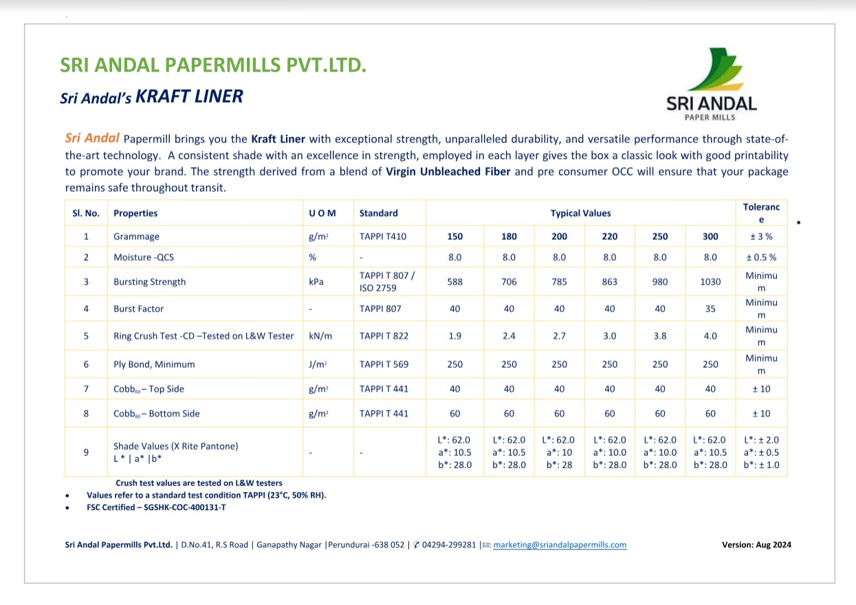 Sri Andal Papermill brings you the Kraft Liner with exceptional strength, unparalleled durability, and versatile performance through state-of-the-art technology. A consistent shade with an excellence in strength, employed in each layer gives the box a classic look with good printability